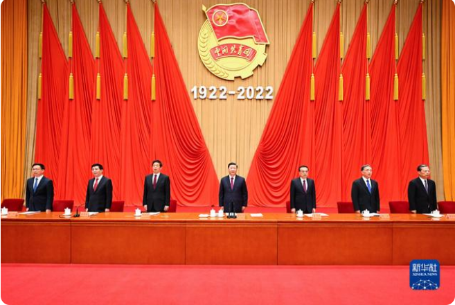人民大会堂二层宴会厅气氛隆重热烈。主席台上方悬挂着“庆祝中国共产主义青年团成立100周年大会”会标,后幕正中悬挂团徽,团徽下方是“1922-2022”字标,10面红旗分列两侧。