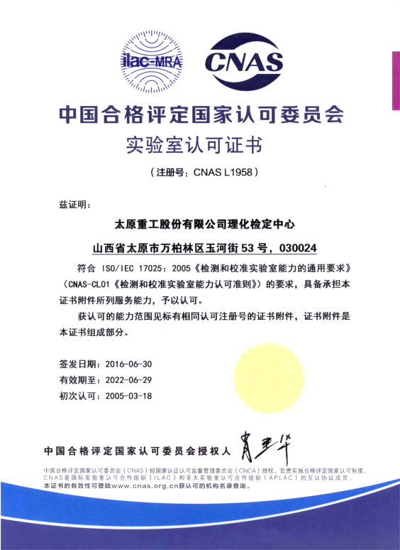 太重已获得CNAS实验室认可证书